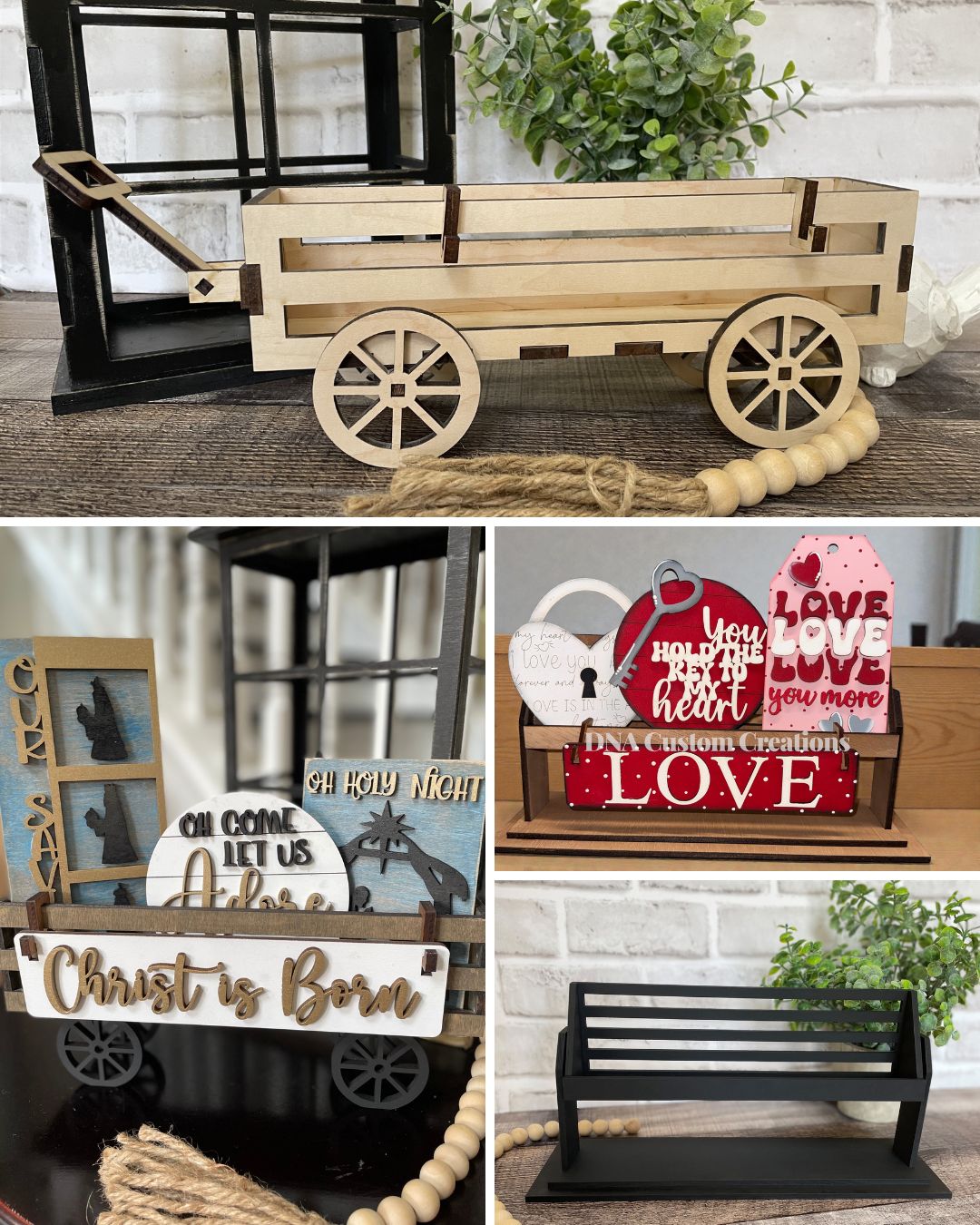 Our finished wagon and bench are ideal additions to any fireplace mantel...